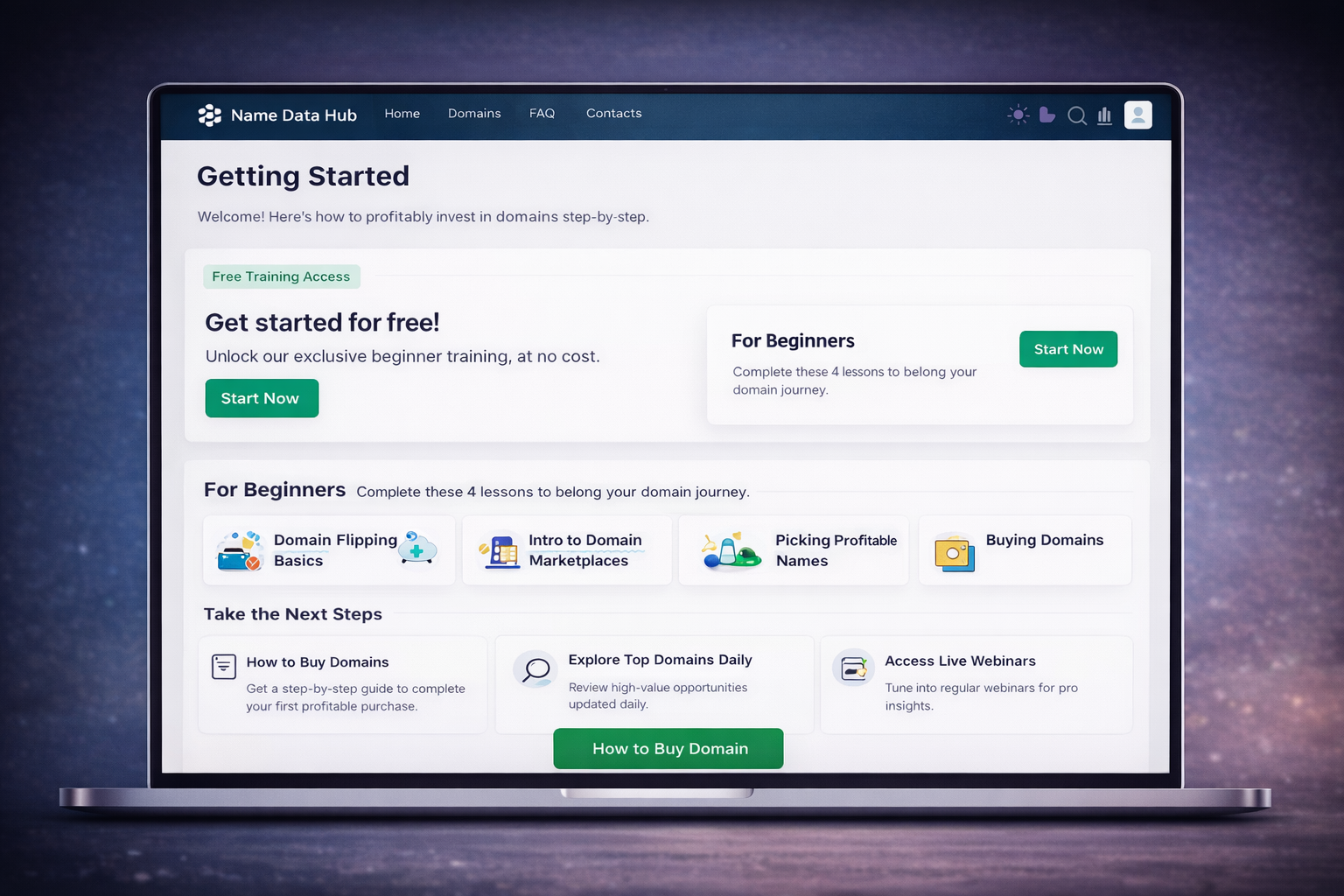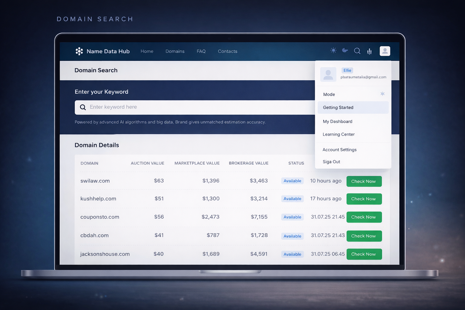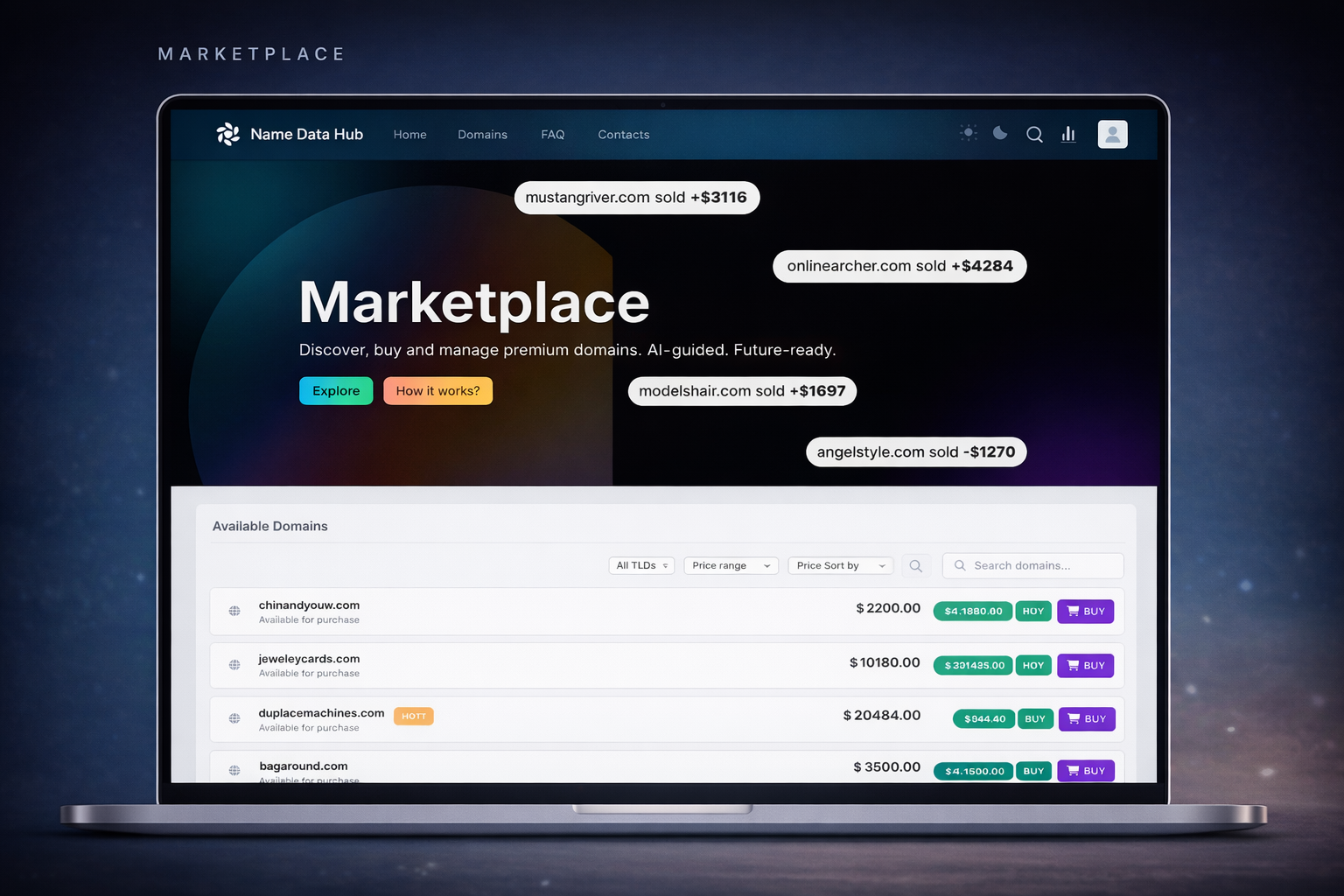 Your dashboard is your personal workspace. It contains AI-selected domain matches, pricing guidance, and a marketplace view so you can understand what sells and why.